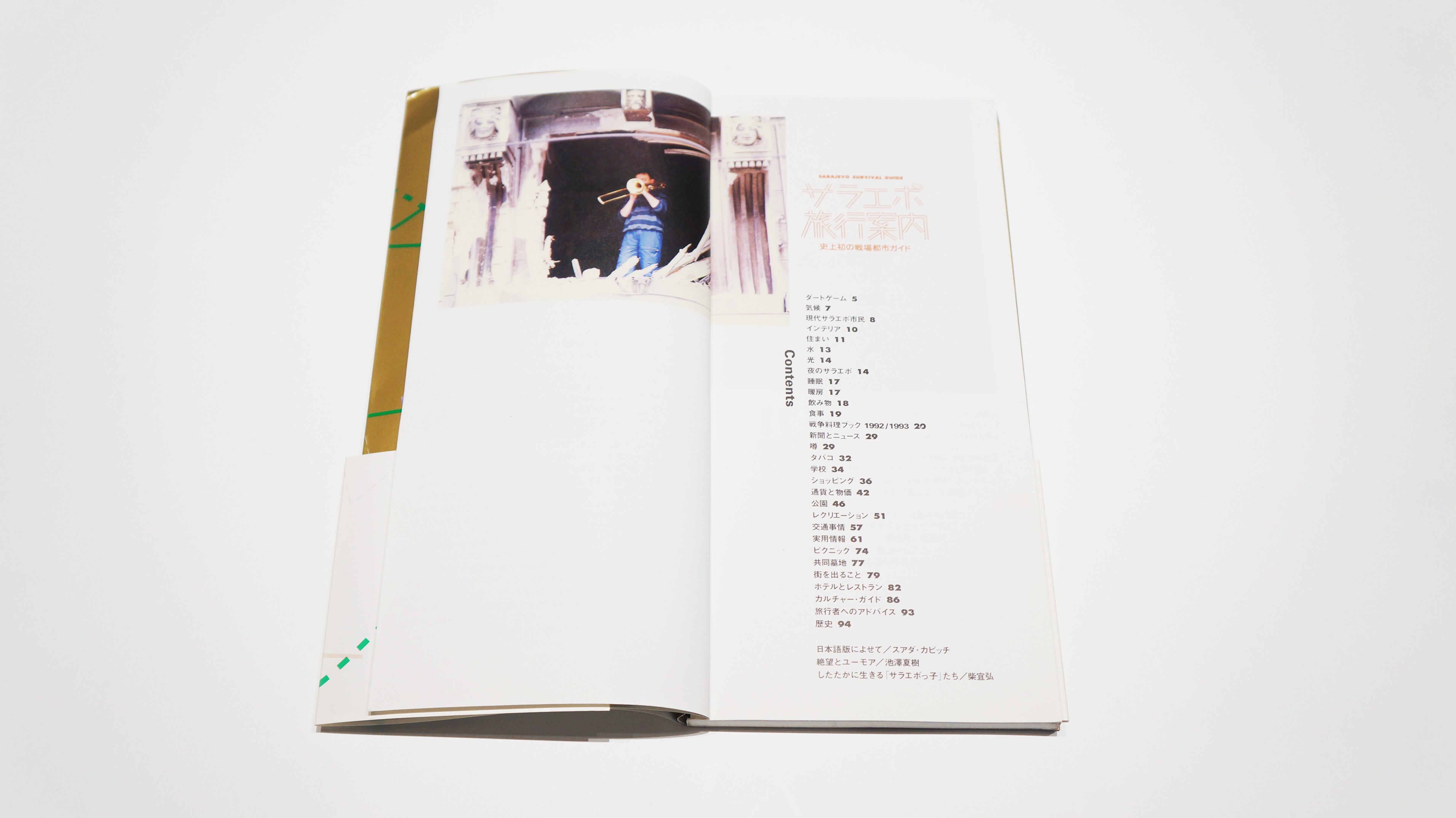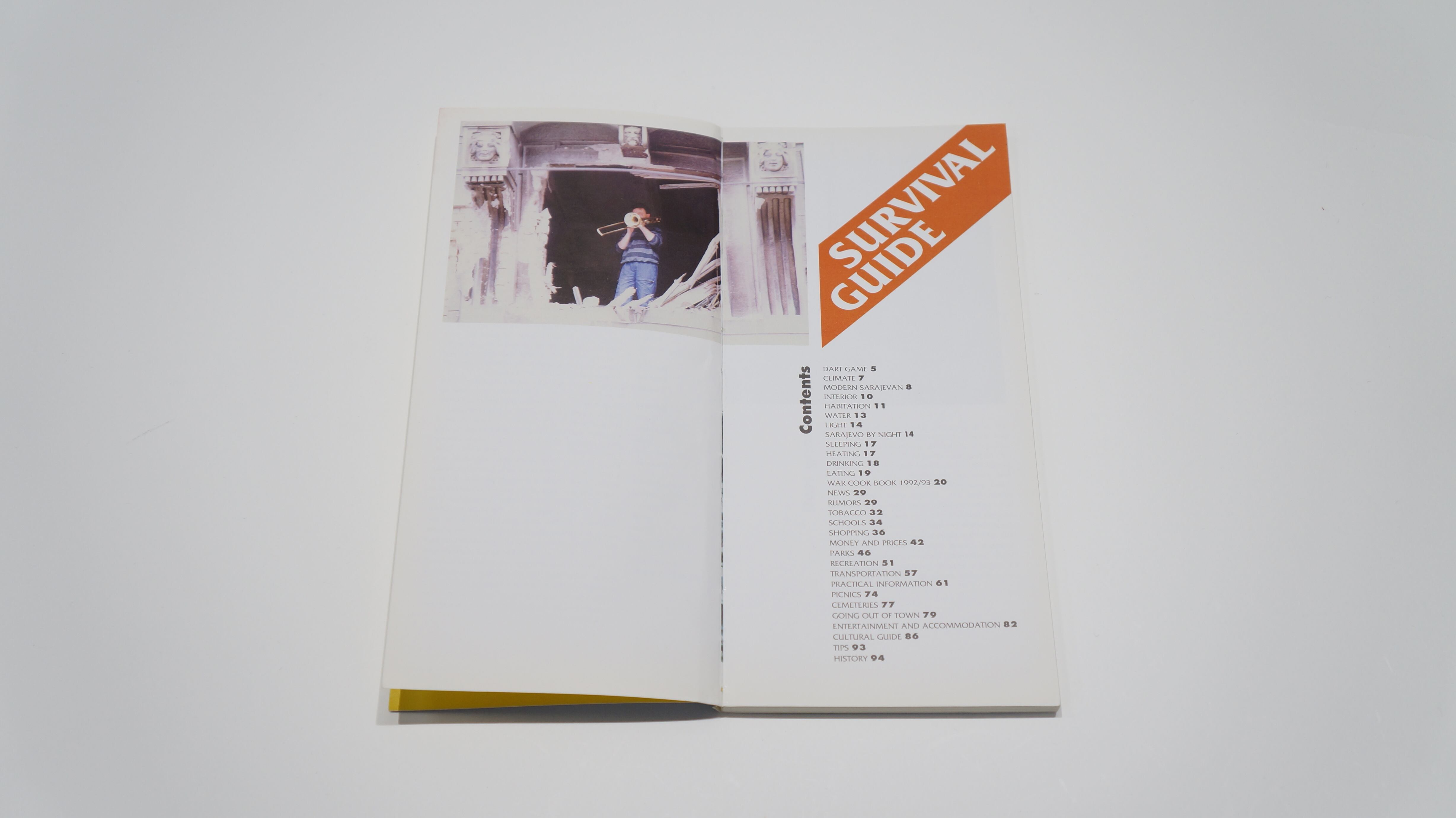 本書は、サラエボ包囲戦の最中、スアダ・カピッチの主催するインディペンデント・プロデューサーグループFAMAとアーティストや文化人により企画されたサバイバル・ガイドブックです。サラエボ市民は、重火器に囲まれ、狙撃兵たちの標的となりながら、飲み水を確保するためだけに一日2時間も費やさなければなりませんでした。このような極限状態に生きる人々の知恵と経験が、ミシュラン社ガイドブックのデザインにまとめられています。多くの人々が命を落す現実のなか、サラエボ市民が生物的サバイバルだけでなく、ラジオやカフェ、出版物の発行、音楽コンサートなどを何とか維持することで、文化的にもサバイバルしたことが、本書から伝わってきます。