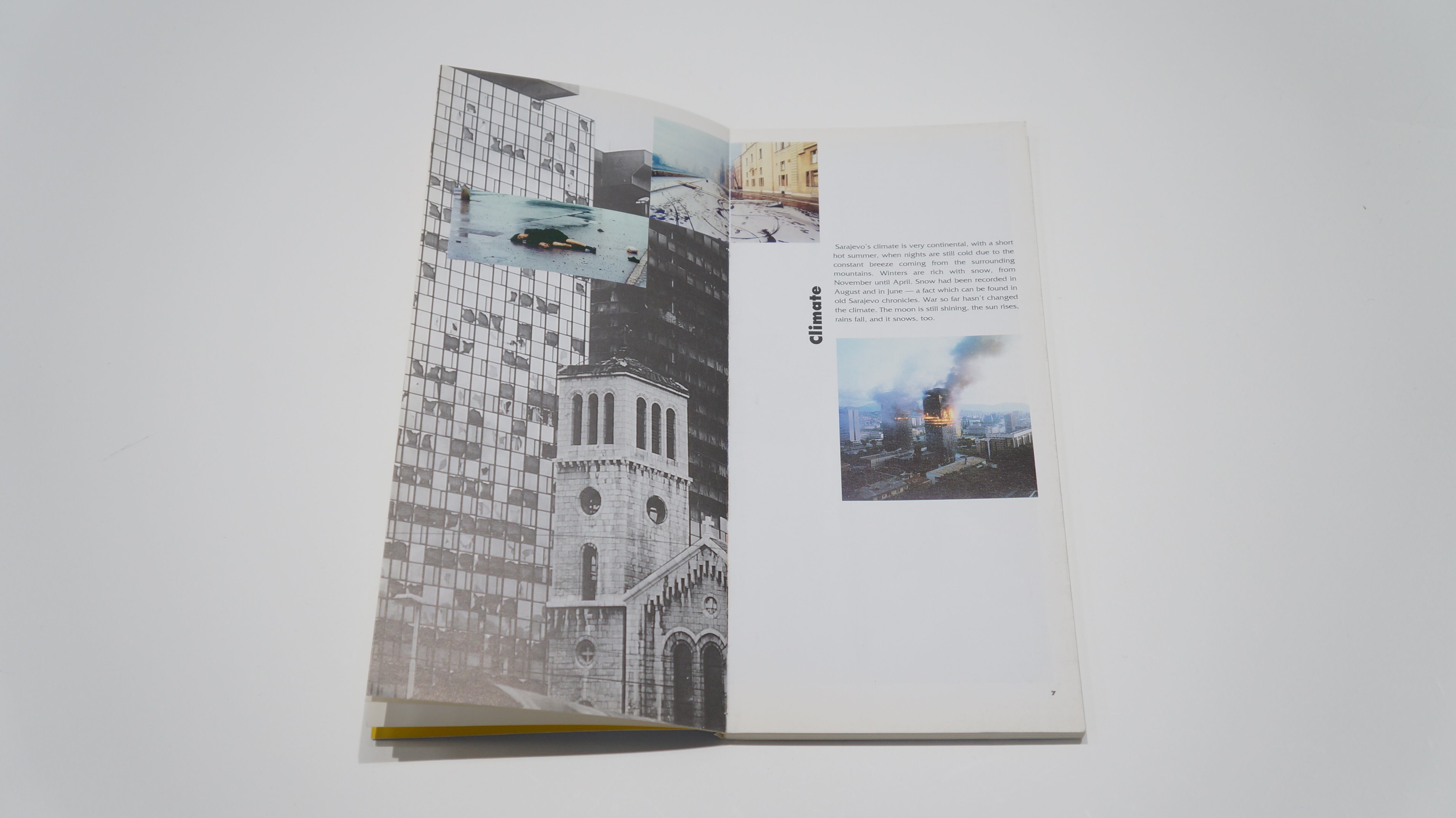During the war, in a besieged town, under the fire of shells and snipers, in conditions impossible for life and work, the Guide Book to Sarajevo was created. It intended to be a version of Michelin, taking visitors through the city and instructing them on how to survive without transportation, hotels, taxis, telephones, food, shops, heating, water, information, electricity. It is a chronicle of survival, a part of a future archive which shows the city of Sarajevo not as a victim, but as a place of experiment where wit can still achieve victory over terror. This book was written at the site on which one civilization was dismantled in the course of intentional violence, and where another one had to be born. That one, which makes something from nothing, gives some messages for the future. Not because the future is necessarily a future in war, but because humans are growing older and being born into a world which is ever less secure.